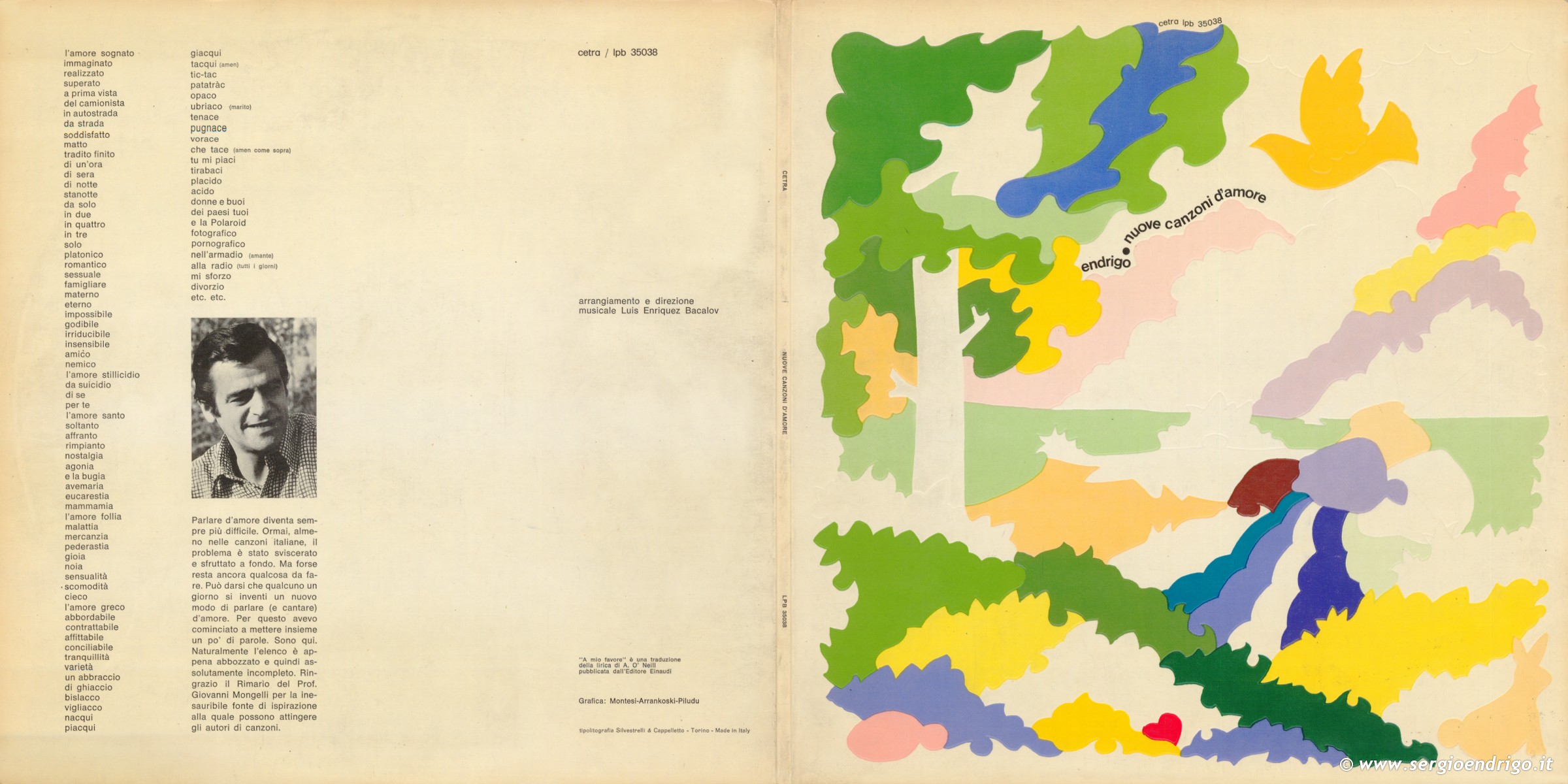 • Copertina apribile: il fronte ha un disegno i cui contorni sono incisi, all'interno i testi delle canzoni, sul retro le note di Sergio